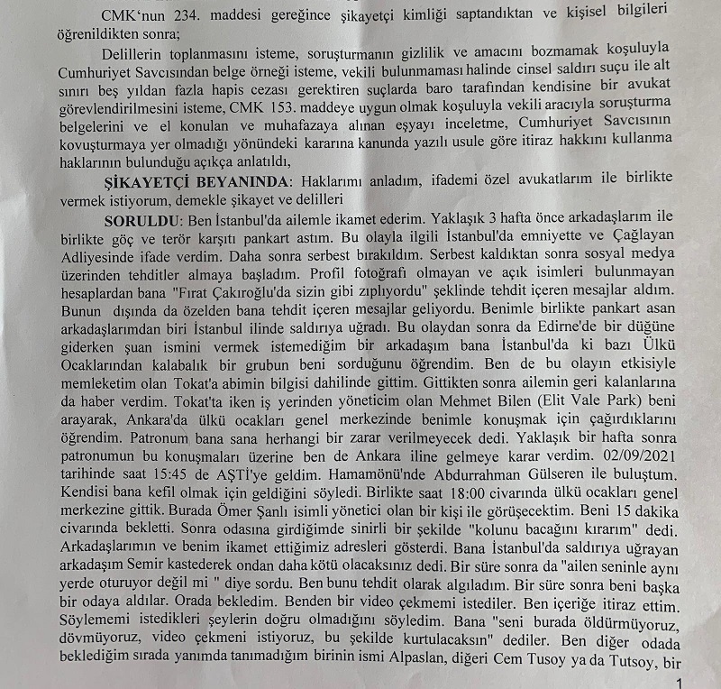 İşte Ahmet Çakmak'ın emniyetteki ifadesi; Ülkü Ocakları Genel Merkezi’ne gittiğini, orada tehdit edildiğini ve videoyu zorla paylaştığını söyledi.