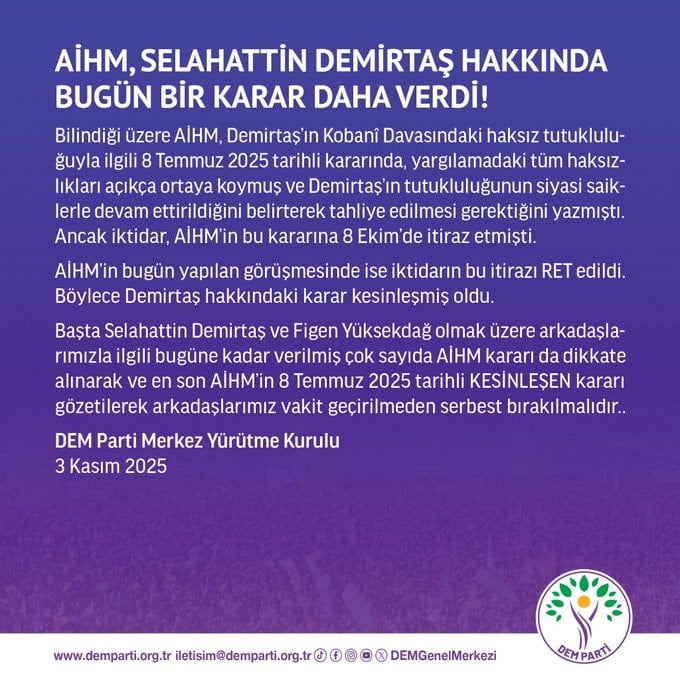 Avrupa İnsan Hakları Mahkemesi'nin (AİHM) 8 Temmuz'da hakkında bir kez daha hak ihlali kararı verdiği eski HDP Eş Genel Başkanları Selahattin Demirtaş ile ilgili yeni bir gelişme yaşandı.