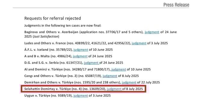 AİHM, Türkiye'nin eski HDP Eş Genel Başkanı Demirtaş kararına yaptığı itirazı reddetti. Böylece AİHM kararı kesinleşmiş oldu.