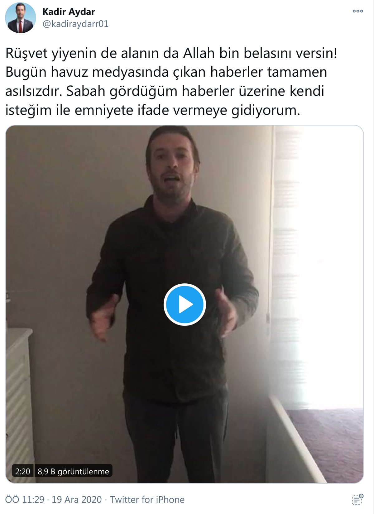 Kadir Aydar ise sosyal medya hesabından, emniyete ifade vermeye gitmeden önce yaptığı paylaşımda, “Rüşvet yiyenin de alanın da Allah bin belasını versin” dedi.