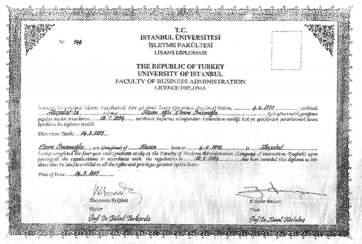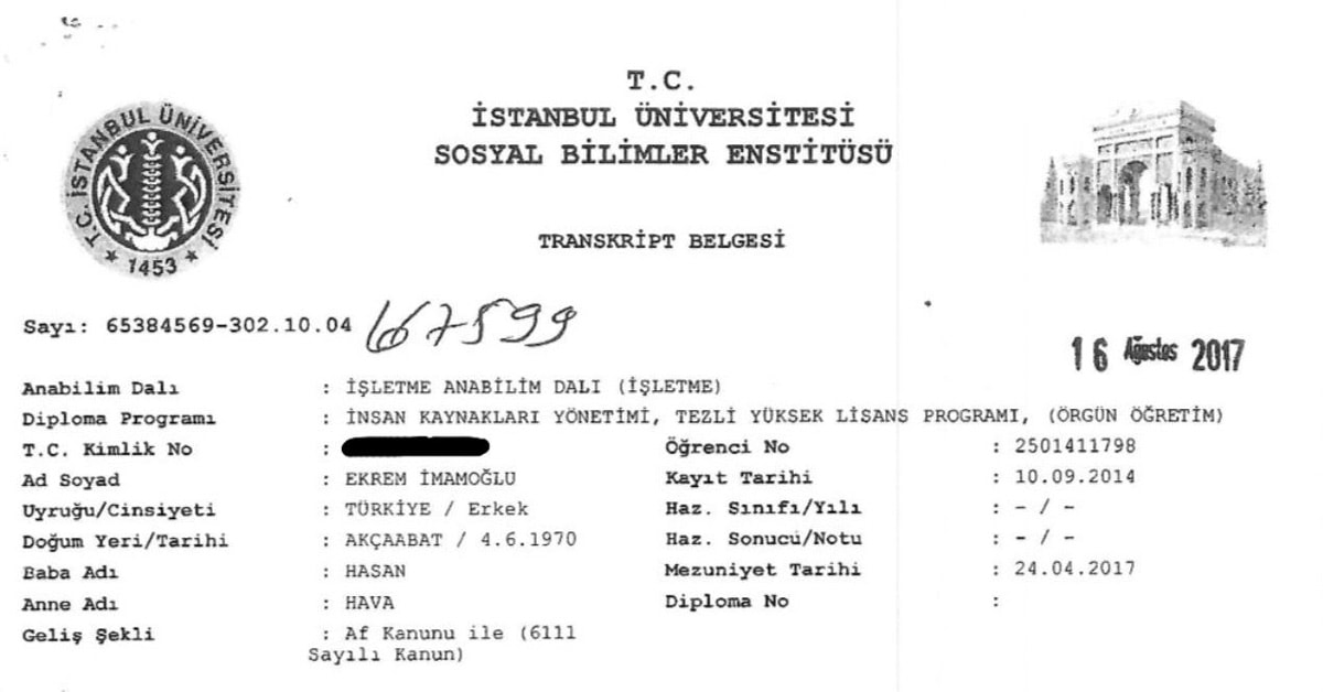 İstanbul Üniversitesi Sosyal Bilimler Enstitüsü'nden aldığı Transkript belgesi 16 Ağustos 2017 tarihini taşıyor. Burada, diploma programının İşletme Anabilim Dalı İnsan Kaynakları Yönetimi, Tezli Yüksek Lisans Programı (Örgün Öğretim) olduğu belirtiliyor.
