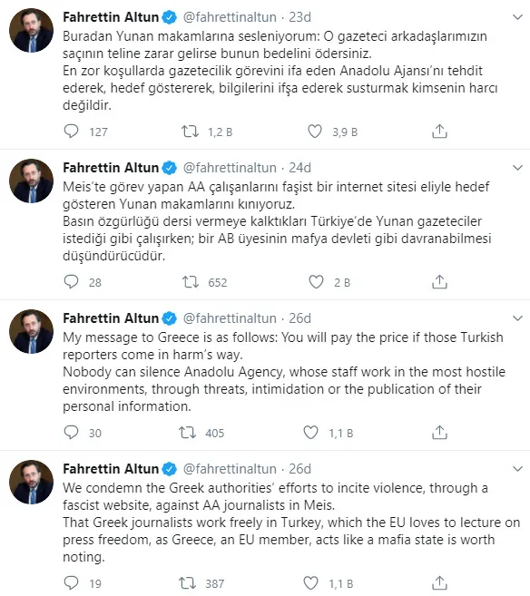 Altun sosyal medya hesabından İngilizce ve Türkçe olarak yaptığı paylaşımda "Altun Meis'te görev yapan AA çalışanlarını faşist bir internet sitesi eliyle hedef gösteren Yunan makamlarını kınıyoruz. Basın özgürlüğü dersi vermeye kalktıkları Türkiye'de Yunan gazeteciler istediği gibi çalışırken; bir AB üyesinin mafya devleti gibi davranabilmesi düşündürücüdür." ifadelerine yer verdi