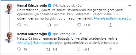 Kemal Kılıçdaroğlu, "Haksızlığa boyun eğmeyen Boğaziçi Üniversitesi akademisyenleriyle #AslaAşağıBakmayacağız diyen gençlerimizle ve aileleriyle beraberiz." ifadelerini kullandı