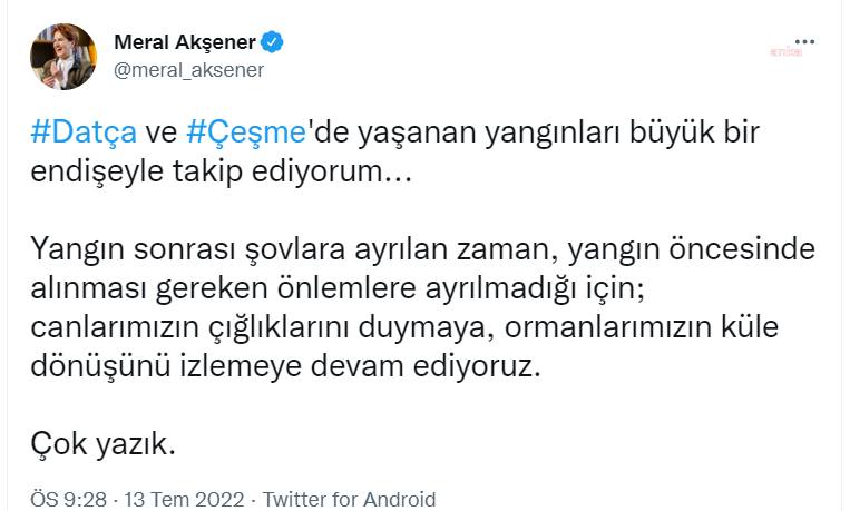 ''Datça ve Çeşme’de yaşanan yangınları büyük bir endişeyle takip ediyorum'' diye yazan Akşener, ''Yangın sonrası şovlara ayrılan zaman, yangın öncesinde alınması gereken önlemlere ayrılmadığı için canlarımızın çığlıklarını duymaya, ormanlarımızın küle dönüşünü izlemeye devam ediyoruz. Çok yazık'' ifadelerini kullandı.