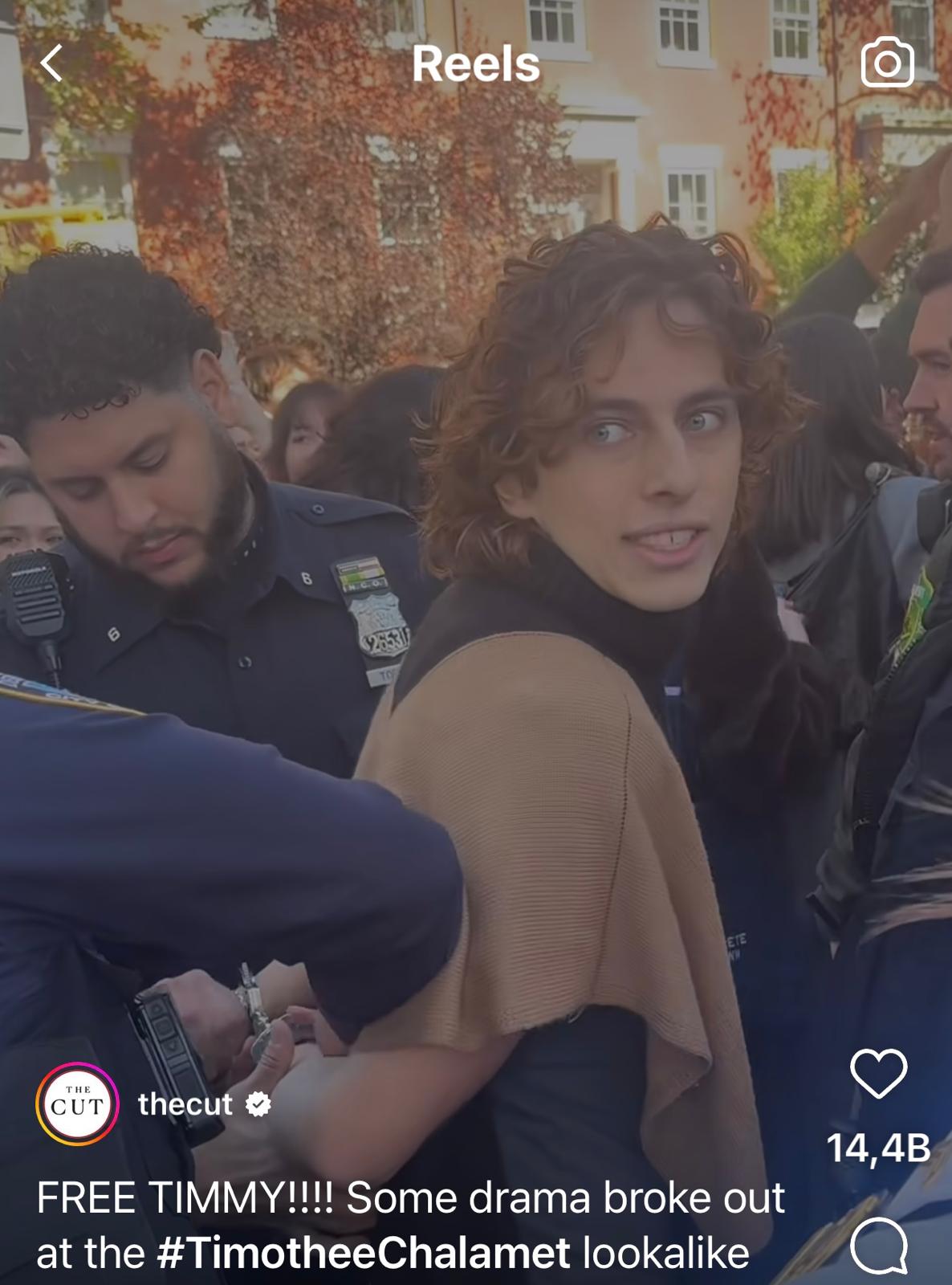 Çünkü yarışmayı izlemeye gelen kalabalık öyle hızla büyüdü ki, Trump ayarlı polisler bir anda “siyasi bir kargaşa çıkıyor” diye Timothee Chalamet’i kelepçeleyip götürmek istediler.